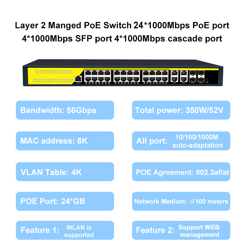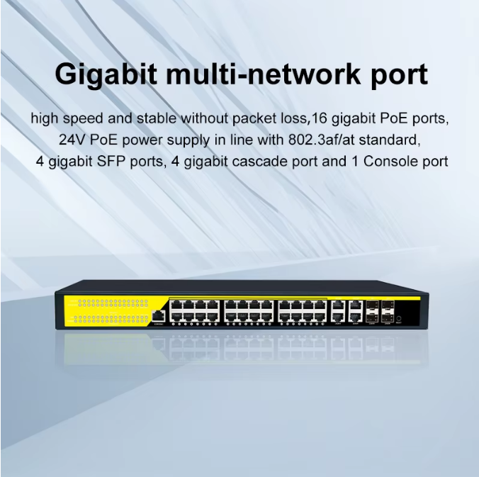– ✅ 24× 1000Mbps PoE RJ45 Ports – IEEE802.3af/at compliant