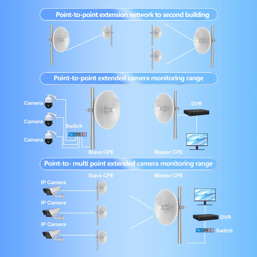 The WB5ACdish is a high-performance, long-distance outdoor wireless bridge designed for industrial-grade point-to-point (PTP) and point-to-multipoint (PtMP) applications. With a powerful 23dBi antenna and advanced chipset, it delivers up to 900Mbps over 5.8GHz, with a maximum transmission range of 20KMβperfect for linking buildings, remote sites, and surveillance networks.